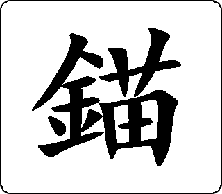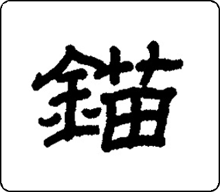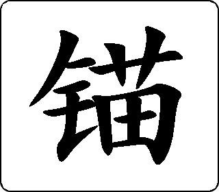 会意字。“金”(钅)像箭头、斧头和矿石,表示锚用金属制成;“猫”省犭,表示锚形似猫爪。錨简化为锚。锚是铁制的停船器具。