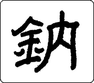 会意字。“金”(钅)像箭头、斧头和矿石,表示锻造、冶炼铁;“内”像入门内,表示打铁、冶铁多在作坊内进行。鈉简化为钠。本义是打铁、冶铁。现用作金属元素名。