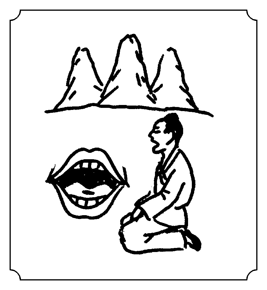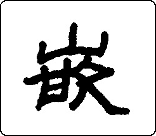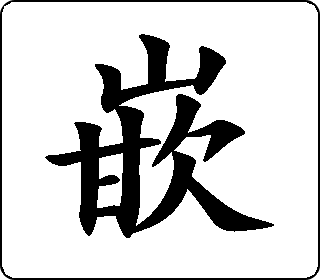 会意字。“山” 像山, 表示山谷很深;“欠”像人张口打哈欠,表示山谷像山开口形;“甘”像口含食物,表示谷中景物深藏。本义是山谷深貌。引申为镶嵌。