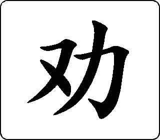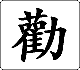 会意字。“力”像农具,“雚”是水鸟,常逆水觅食,表示鼓励人力争上游。简体字又、力,表示一次又一次地尽力鼓励或劝说。本义是鼓励。