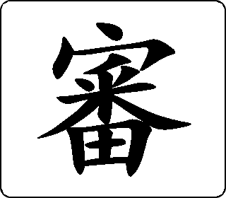 会意字。“宀”像房屋,“釆”像兽足,“田” 像农田, 表示细察屋内、田里的兽足印。简体字“宀” 指房屋, 有覆盖意,“申”像闪电,有明白义,表示细察以明白被表象覆盖的真相,申(shēn)兼表声。本义是细察。