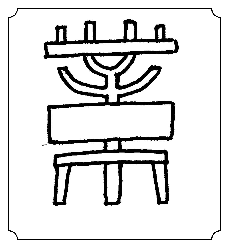 象形字。篆书像悬挂钟磬的木架,表示乐器架子横木上的大版。简体字仅保留其上端。本义指古代乐器架子横木上的大版。