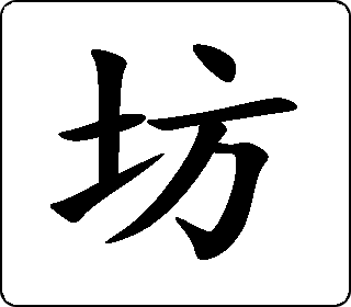 ㈠fāng ①里巷;市街:街坊。 ②像牌楼的建筑物:牌坊。 ㈡fáng 小手工业的工作场所:作坊│染坊。